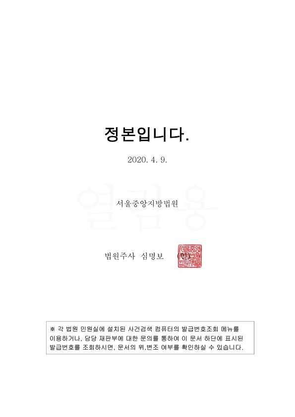 결정문 2020년 04월 09일 [서울중앙지방법원 1심 화해권고결정문]