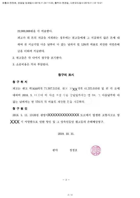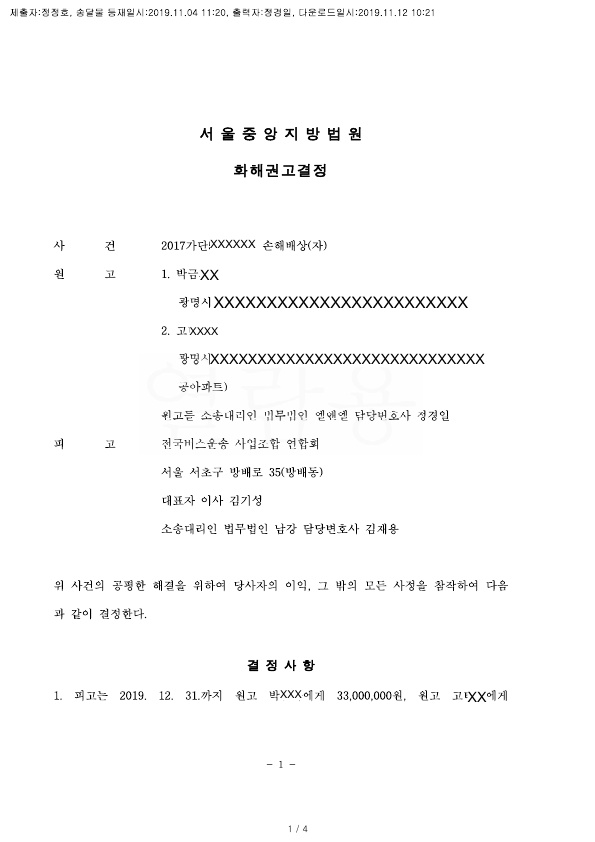 결정문 2019년 11월 04일 [서울중앙지방법원 1심 화해권고결정문]